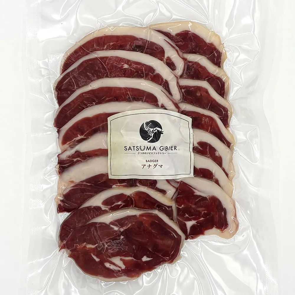 鹿児島県産の天然穴熊肉(アナグマ肉)を食べやすいスライスにしました。 脂の甘さと濃厚な旨味が特徴で、ジビエ初心者でも食べやすい人気商品です。