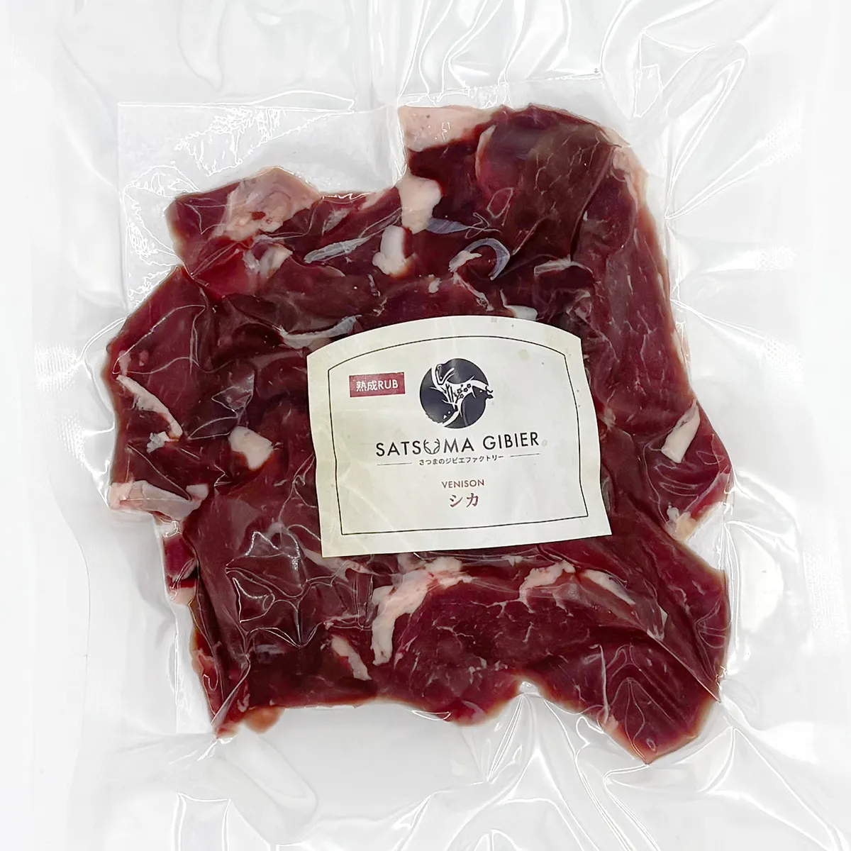 鹿児島県産の鹿肉を、独自の塩糖熟成で仕上げた「熟成RUB鹿モモ」のお得な切り落としです。しっかりとした赤身のモモ肉に、ほんのり塩味がついており、焼くだけで簡単にジビエ本来の旨みが楽しめます。