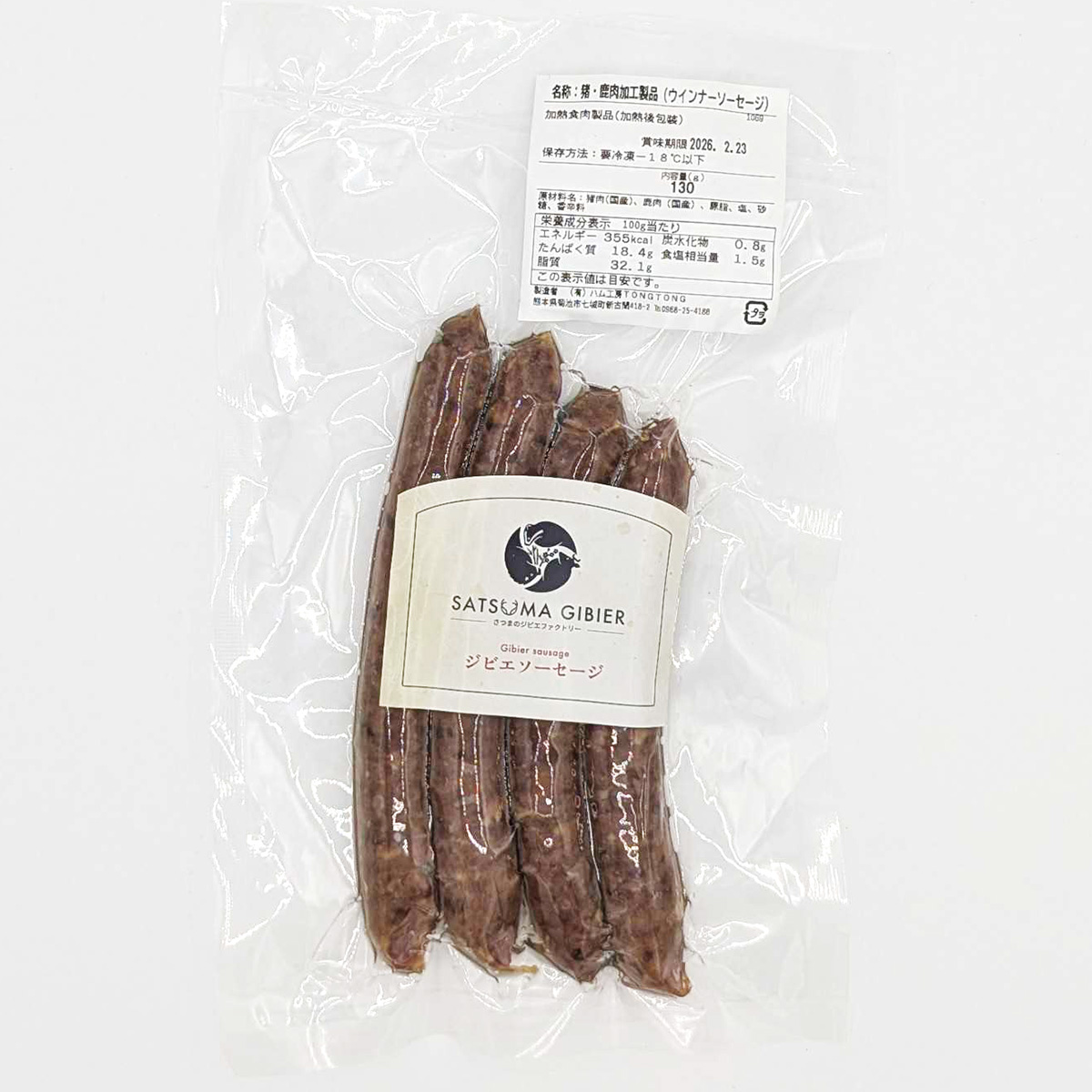 鹿児島県さつま町産の猪肉と鹿肉を使用した、ジビエならではの旨みを凝縮したソーセージです。ほどよいスパイスが効いており、濃厚な旨みと後味の良さが楽しめます。さらに、発色剤や結着剤など不使用で完全無添加で製造しており、お子様から安心してお召し上がりいただけます。