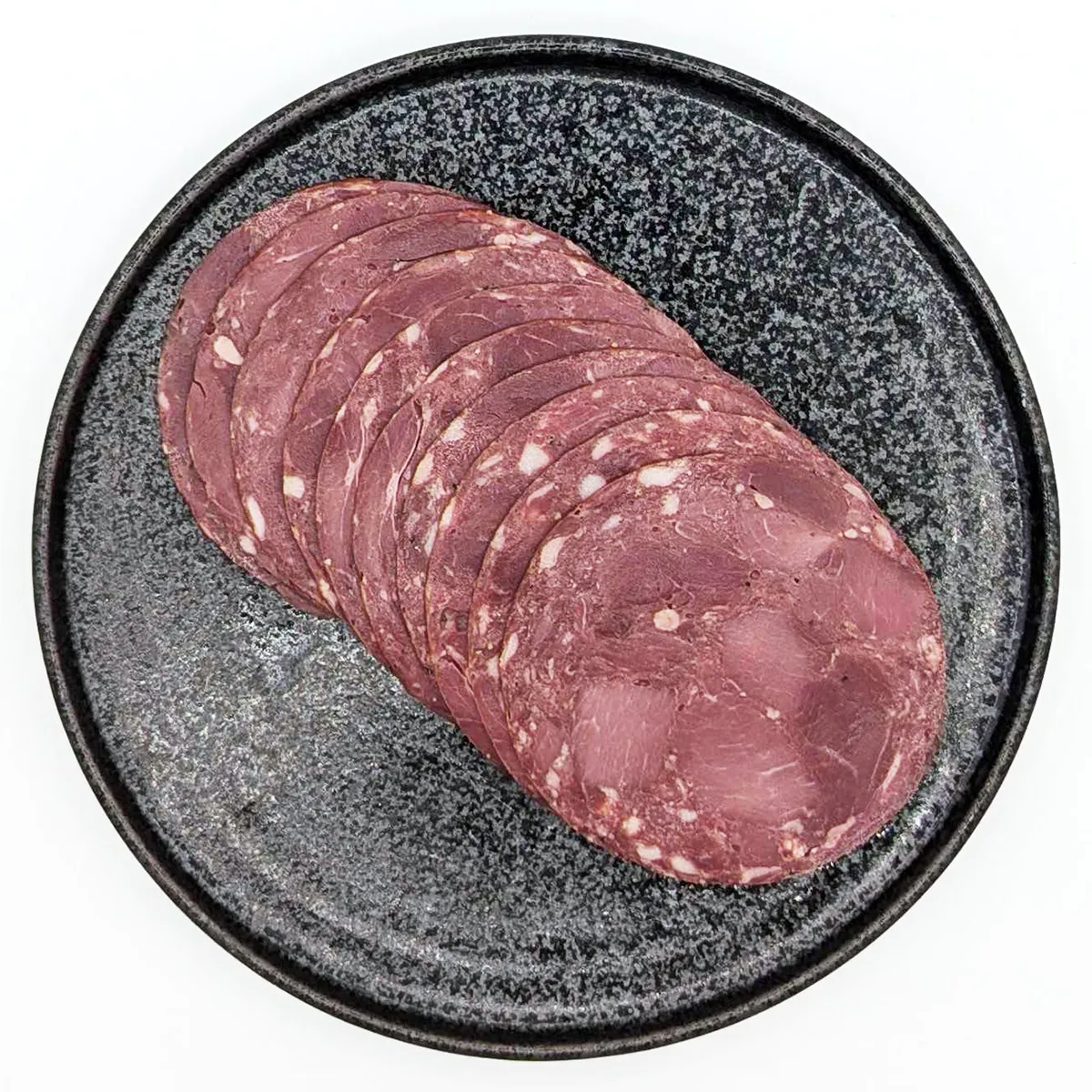 この猪肉のビアシンケンは、猪肉ならではの力強い旨みに、様々な香辛料を効かせ、さらに粗挽きの猪肉を混ぜ込むことで、深いコクと満足感のある食感を実現しました。口に入れた瞬間に広がる猪肉の野性味あふれる風味と、スパイスの絶妙なバランスが食欲をそそります。