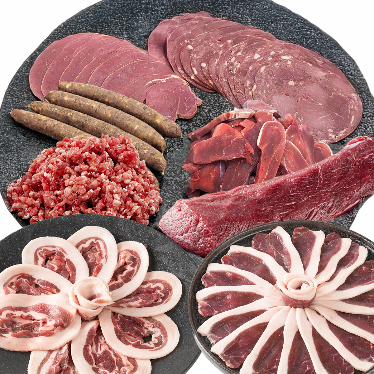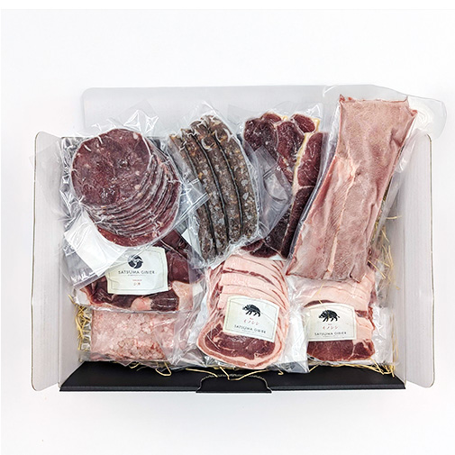 鹿児島県産の鹿・猪を使用し、お酒のおつまみにすぐに楽しめる「ハム・ソーセージ」から、お料理の主役になる「ロース・バラ・ミンチ」まで、人気部位と加工品を計8種、たっぷり約1.9kg詰め込みました。