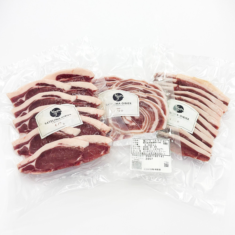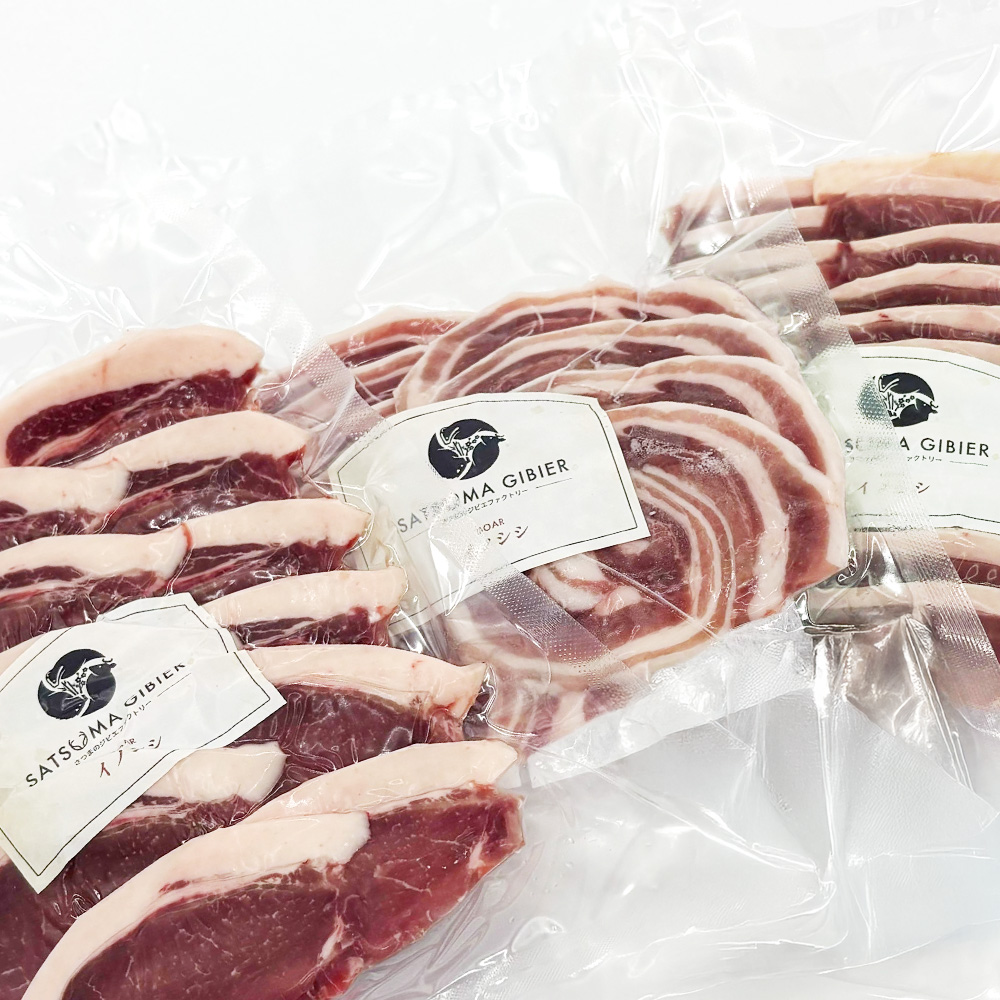 | 商品名 | 猪ロース肉(または肩ロース肉)、猪バラ肉、猪モモ肉(スライス) |